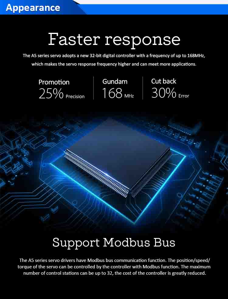 2.Stöder 7 kontrolllägen: position, hastighet, vridmoment, position/vridmoment, position/hastighet, hastighet/vridmoment och position/hastighet/vridmoment.
